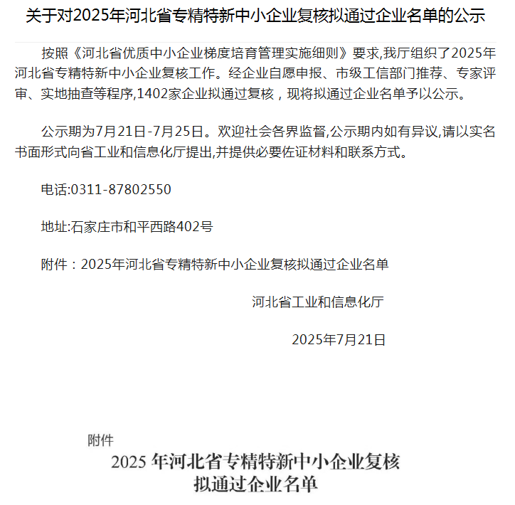專精特新中小企業(yè)認定由省工業(yè)和信息化廳負責,獲此認定不僅是一項極高的榮譽,更意味著企業(yè)在金融服務、技改項目、培育項目資助申請等方面將獲得政策傾斜,對提升企業(yè)品牌影響力和產(chǎn)品知名度具有重要意義。此次復核工作依據(jù)《河北省優(yōu)質(zhì)中小企業(yè)梯度培育管理實施細則》開展,采取線上填報與線下報送相結(jié)合的方式,對企業(yè)的多方面情況進行了嚴格審查。